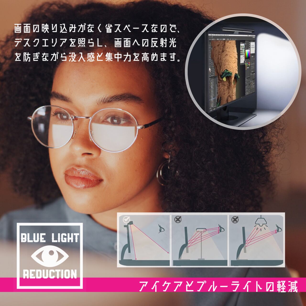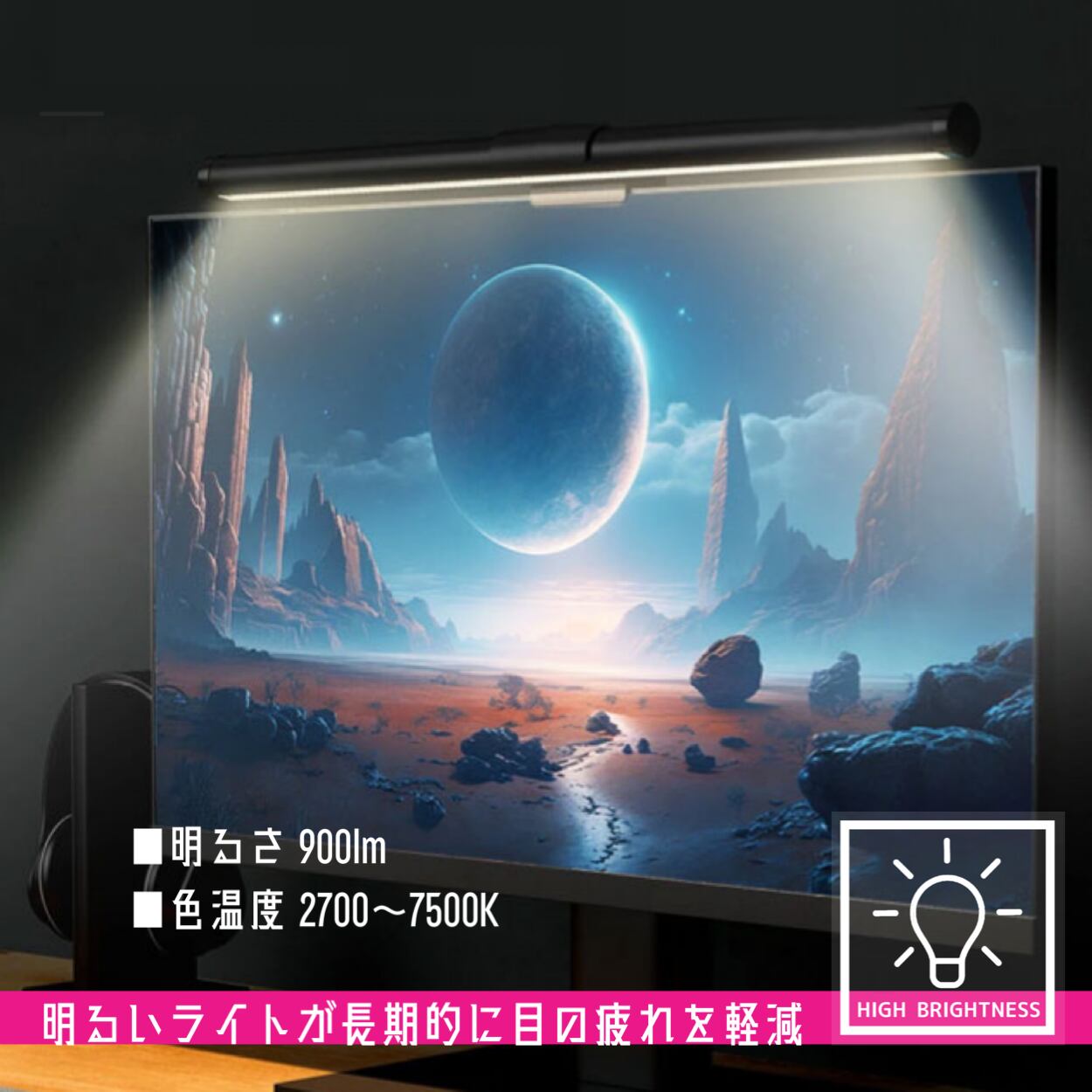 ●モニター上に設置するので、場所を取らず、明るさがほしい範囲を照らすことができます。 ●電源はUSB給電で、パソコンやデスク上のUSB充電器に繋いで利用可能です。