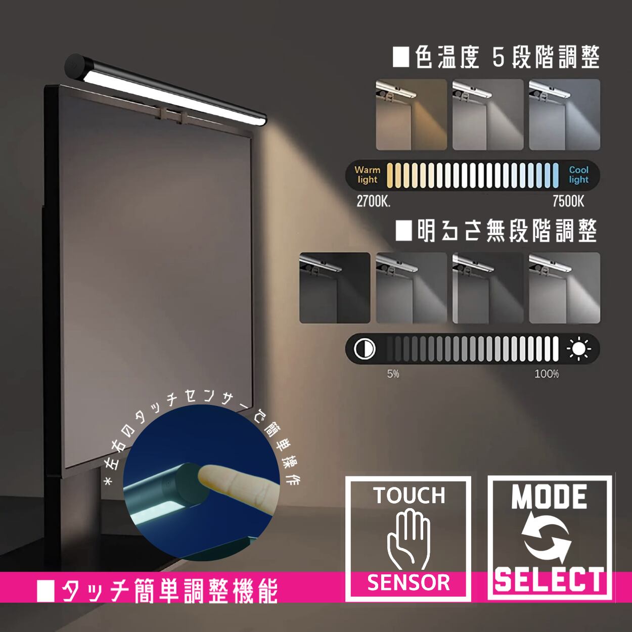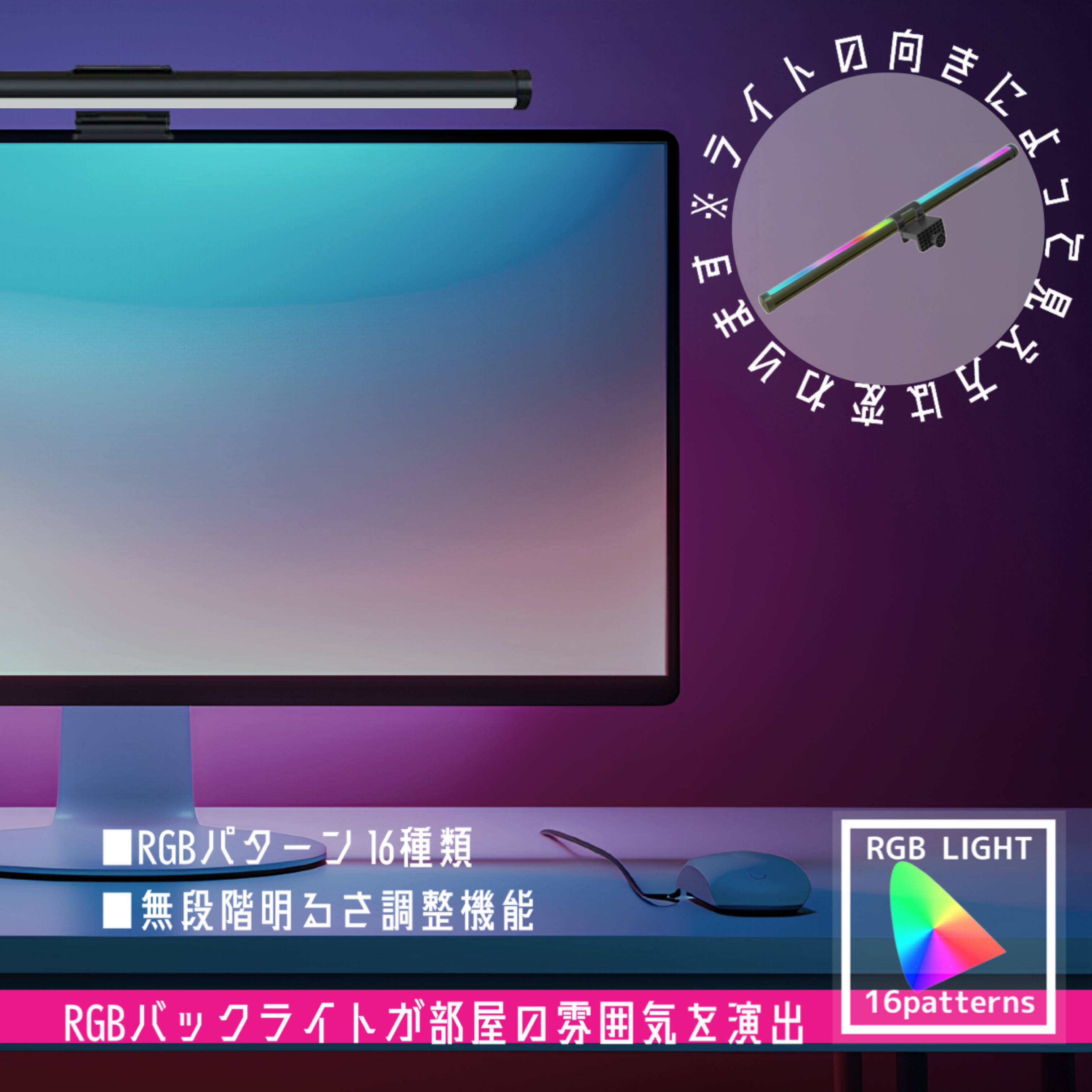 バックライト搭載LEDモニターライト。背面のバックライトは16種類のRGB点灯パターンを備え、お部屋の雰囲気を彩ります。■電源:DC5V 2A/min■色温度2700K~6700K■光束:900lm ■調光:無段階調節 ■材質:プラスティック■LEDタイプ:RGB/WW/CW ■RGBパターン:16種類 ■コントロール:タッチコントロール ■コネクタ:USB Aコネクタ ■サイズ:W442*D43*H99mm(固定ネジ最大まで広げた時)